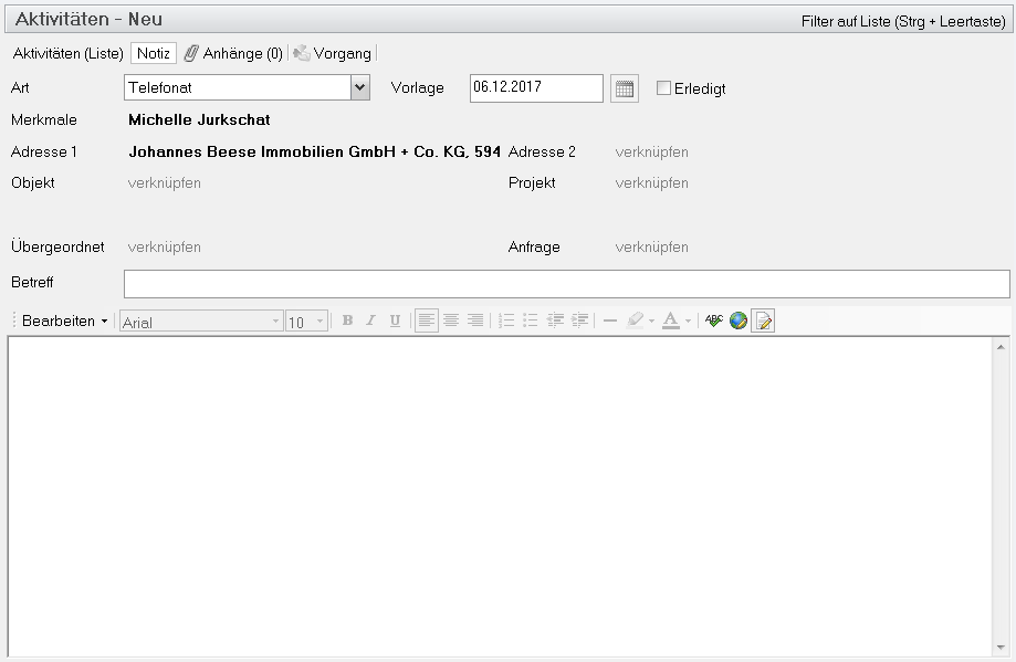 Tragen Sie im Betreff Ihre Aktivität ein. Tragen Sie hier wichtige Schlagwörter, wie z.B. einen Ort, einen Namen, um welche Objektart es sich handelt oder ähnliches ein. Dies ist sehr wichtig, damit auch Sie nach monaten auf diese Aktivität zurückgreifen können.