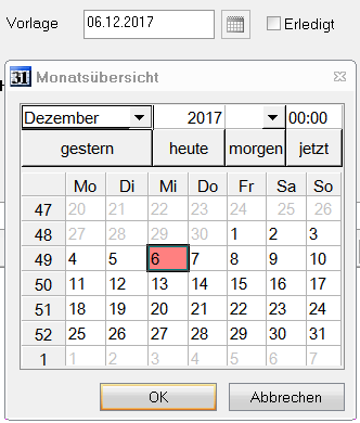 Wenn es sich um eine Wiedervorlage, aber mit einem anderen Datum handeln soll, kann man entweder das angegebene Datum überschreiben oder man wählt über das Kalendersymbol