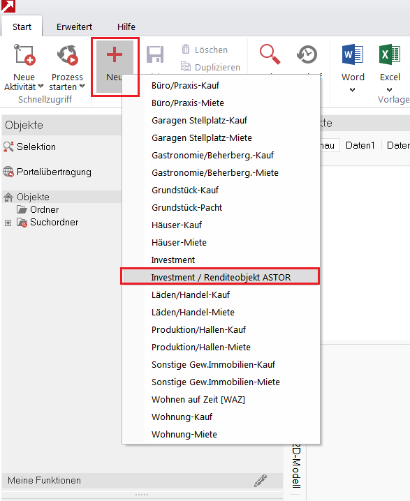 Nun klicken Sie auf „Neu“ und immer auf „Investment/ Renditeobjekt ASTOR“!