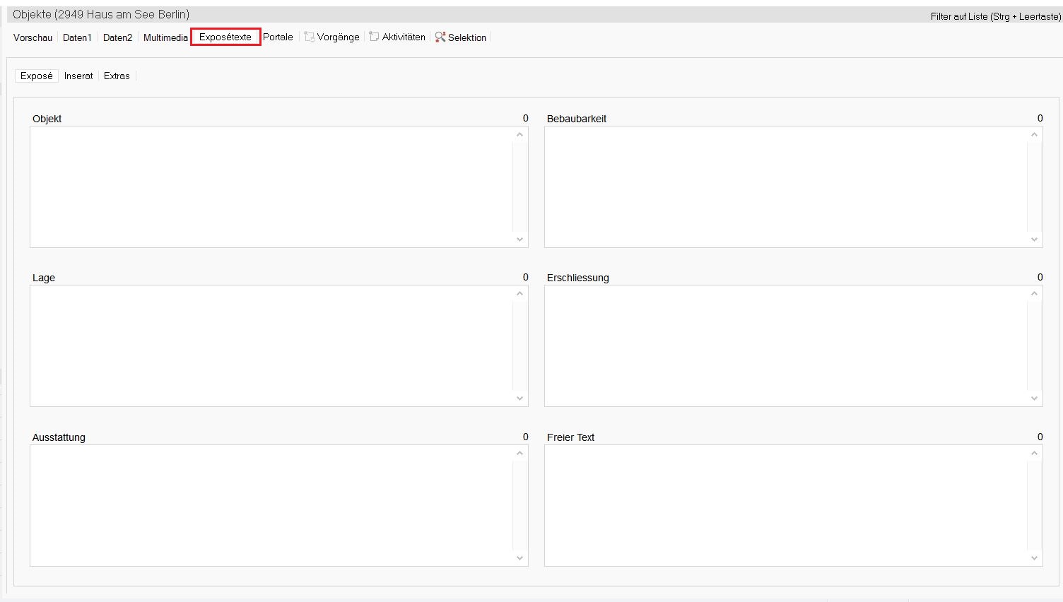 Nun kommen wir zu den Texten im Expose. Dazu klicken Sie auf „Exposetexte“. Hier können Sie etwas zu Ihrem Objekt, zu der Lage, zu der Ausstattung etc. schreiben.
