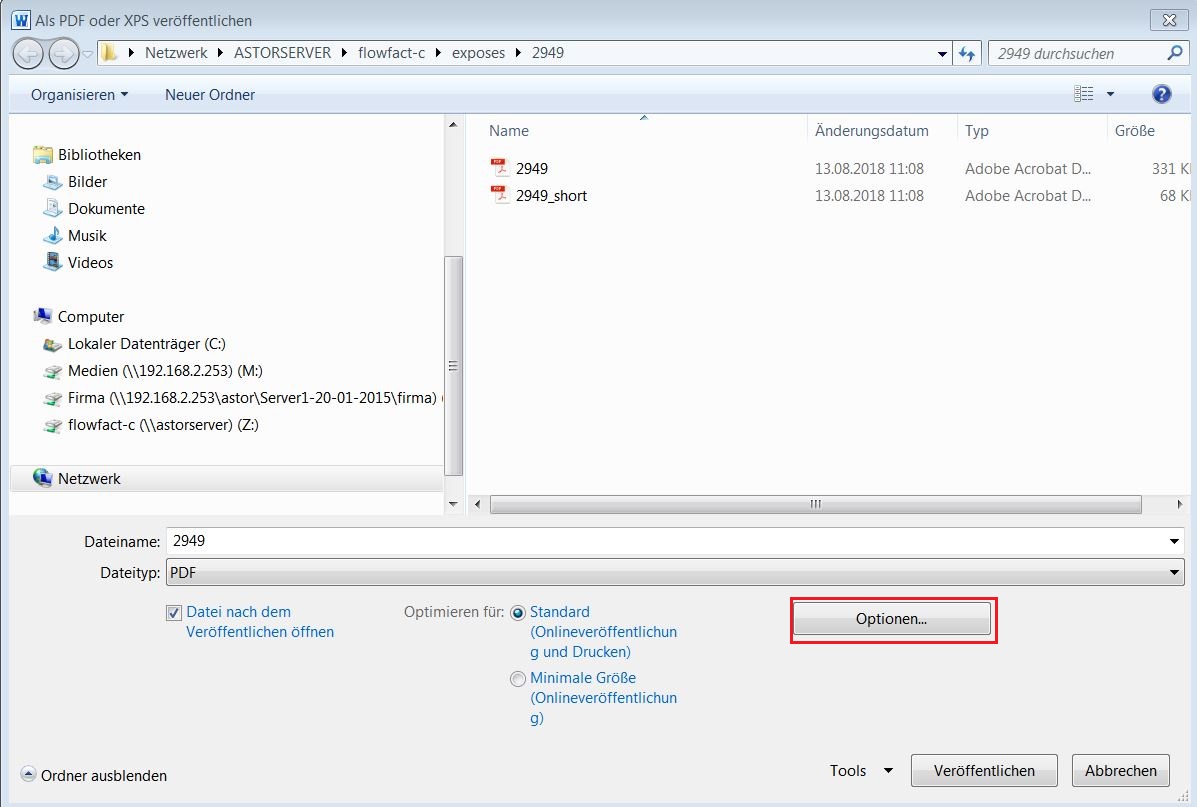 Es öffnet sich ein neues Fenster. Hier können Sie festlegen, wo Sie Ihr Expose speichern möchten. Bevor Sie das tun, klicken Sie auf „Optionen..“