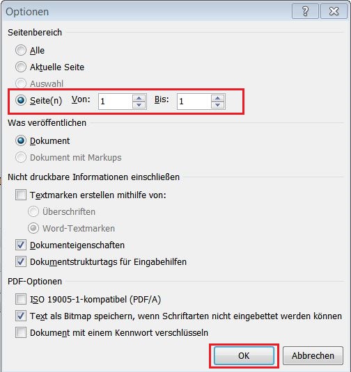 Es öffnet sich wieder ein neues Fenster. Hier können Sie die Seiten auswählen, die Sie als PDF haben möchten. Das bedeutet: klicken Sie auf „Seite(n)“ und füllen Sie das „Von:“ und „Bis:“ aus. Das Datenblatt sollte von: 1 bis: 1 sein. Klicken Sie auf „OK“ und Ihr Datenblatt wird gespeichert. Führen Sie das nochmal durch, aber diesmal Von: 2 Bis: (das letzte Blatt Ihres Exposes) und klicken Sie auf „OK“ und Ihr Expose wird gespeichert.