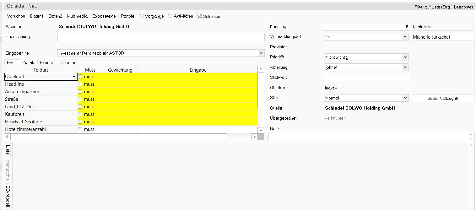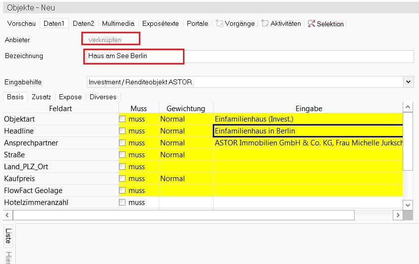 - die Kategorien ausfüllen -> Objektart immer mit (Invest.), die Headline ist die Überschrift im Expose, Ansprechpartner ist der Mitarbeiter der das Objekt verkauft etc…