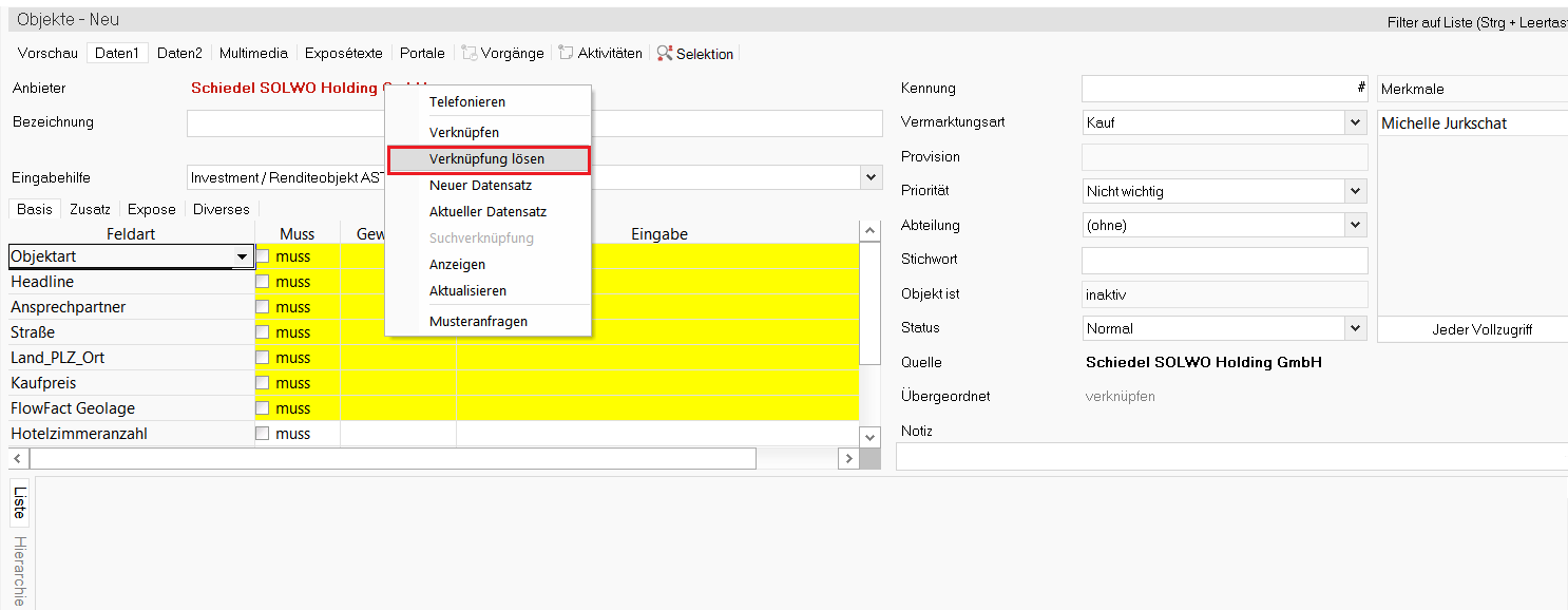 Bevor man die jeweiligen Kategorien ausfüllt, muss man zuerst, wenn vorhanden die Verknüpfungen vom Anbieter und der Quelle lösen, wenn die Firma nicht der Verkäufer ist: