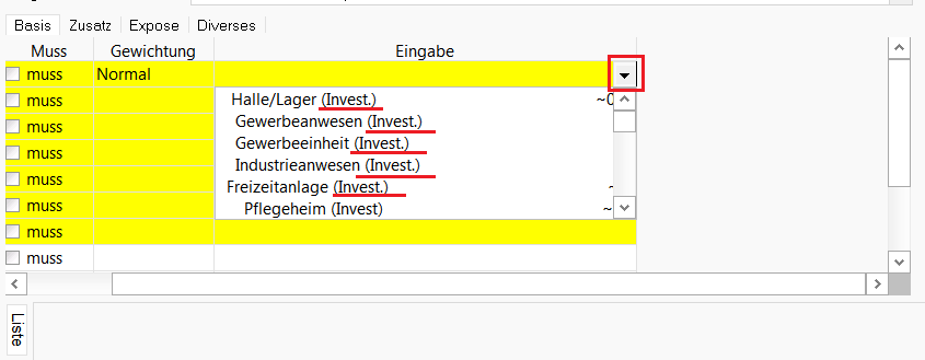 Bei der Objektart ist es wichtig, die Objekte immer mit (Invest.) auszuwählen!