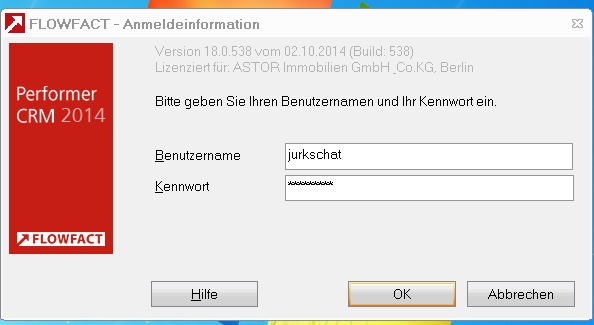 Geben Sie Ihren Benutzernamen und Ihr FlowFact-Kennwort ein und klicken auf OK.
