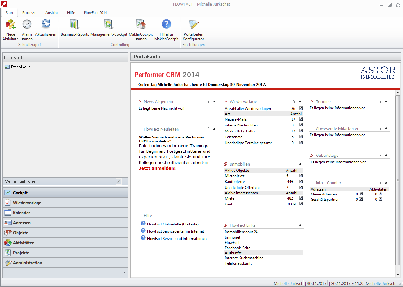 Es erscheint das FlowFact-Cockpit als Startseite: