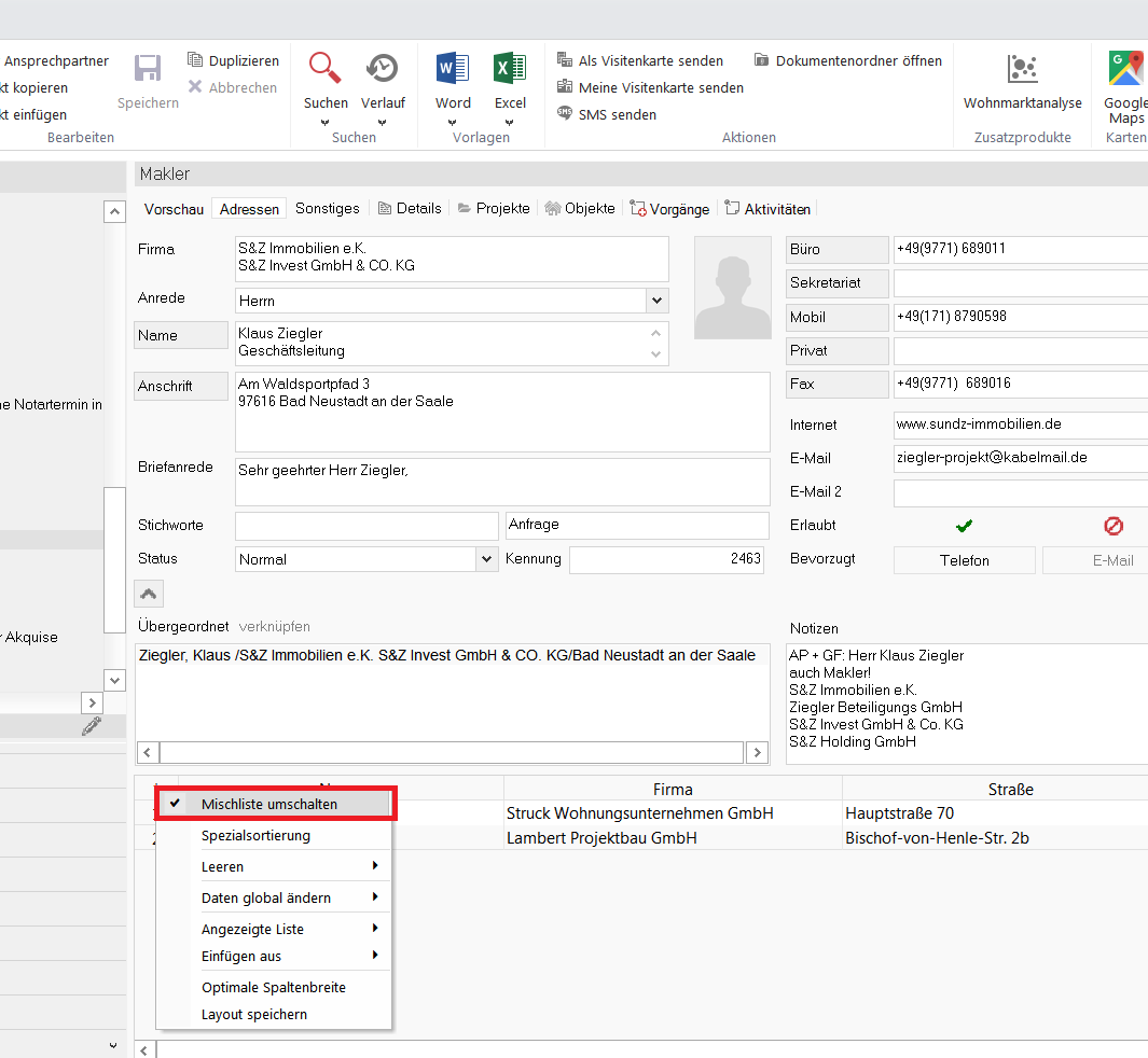 Jetzt können Sie weitere Adressen zu Ihrer „Mischliste“ hinzufügen, indem Sie entweder die weiteren Adressen Suchen oder die jeweiligen Suchcontainer wie Akquiselisten anklicken. ACHTUNG: wählen Sie eine Akquiseliste aus, so wird automatisch die GANZE LISTE in Ihre Mischliste aufgenommen!