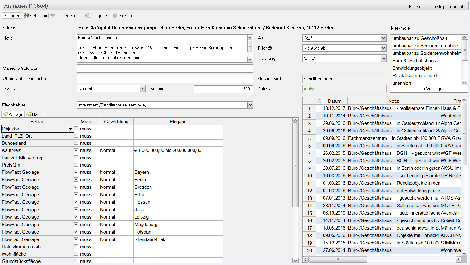 Eine Selektion wird durchgeführt, um potentielle Käufer für eine Immobilie zu finden. Ziel der Selektion ist das Erstellen von Adresslisten, denen dann das Angebot per E-Mail oder telefonisch übermittelt werden kann.