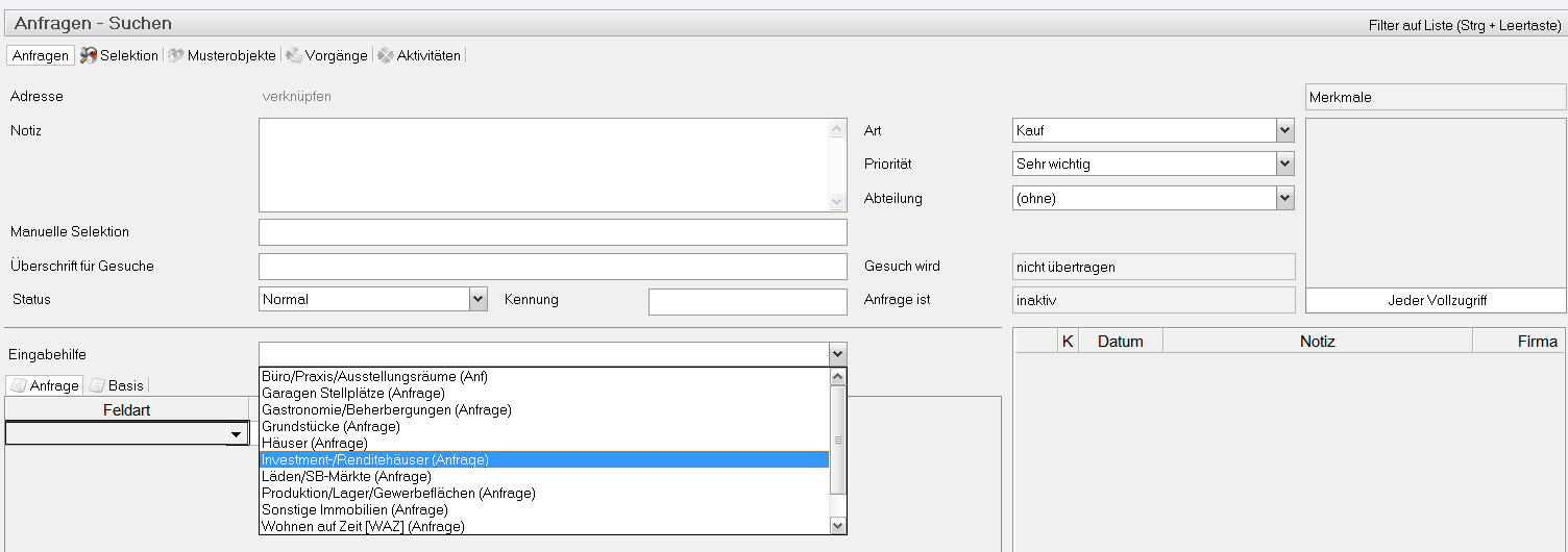 Jetzt die Eingabehilfe „Investment/Renditehäuser (Anfragen)“ auswählen (für Grundstücke „Grundstücke (Anfragen)“):