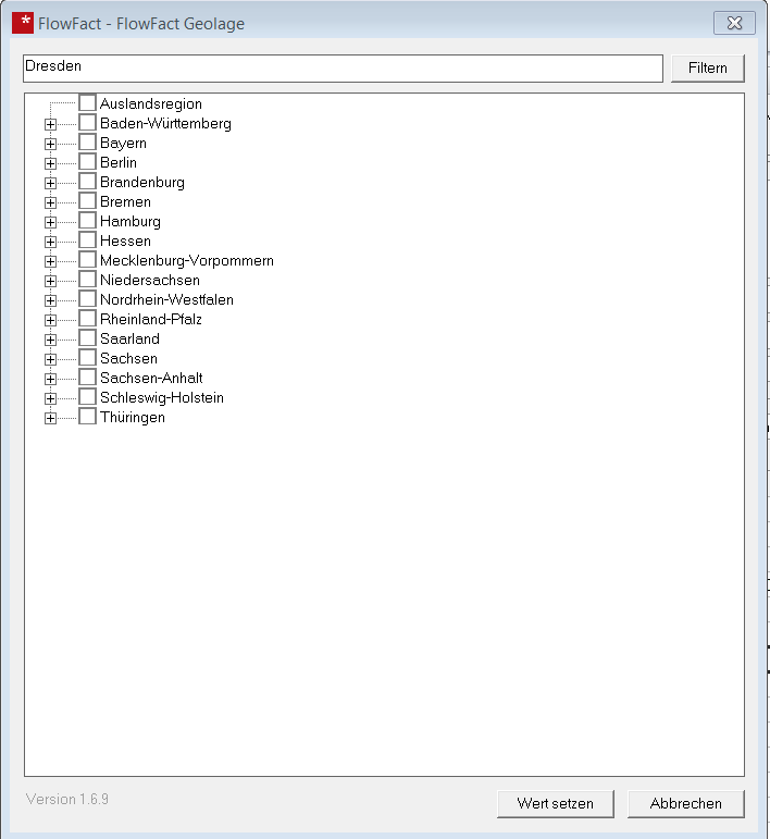 Ins weiße Feld neben FLOWFACT Geolage klicken. Es öffnet sich das Geolagen-Fenster: