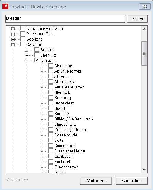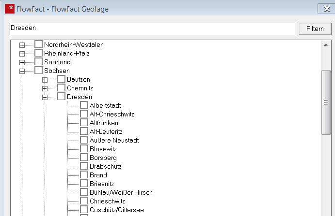 Nun kann man sich durch den Verzeichnisbaum klicken und die gewünschten Orte oder Bundesländer auswählen. Oder man gibt den Ort ein und klickt auf Filtern: