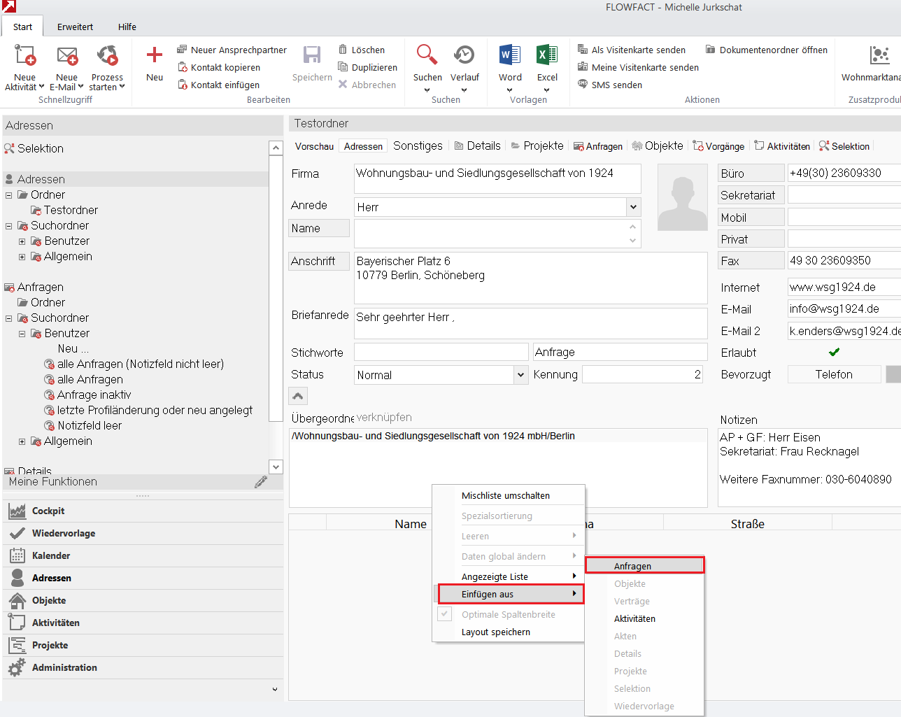 FLOWFACT zieht die Liste der Adressen mit den Anfragen aus dem Ordner mit den Investorenadressen ab und listet Ihnen die restlichen Adressen im Adressfenster auf.