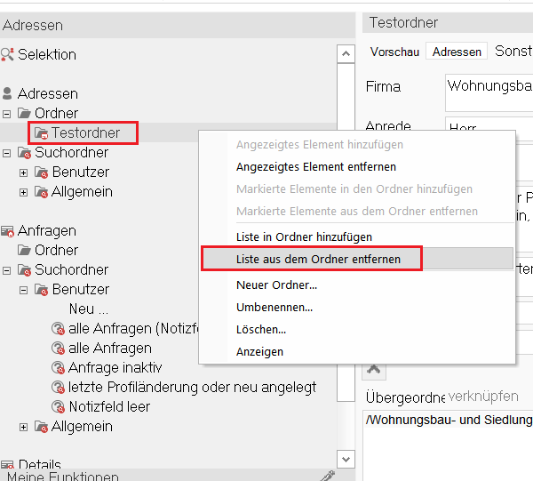 Der erstellte Ordner kann dann per Rechtsklick „Löschen…“ wieder gelöscht werden. Dieses Vorgehen müssen Sie beim nächsten Mal genauso wieder durchführen, da sich zwischenzeitlich Ihre Adressen und Anfragen ändern.