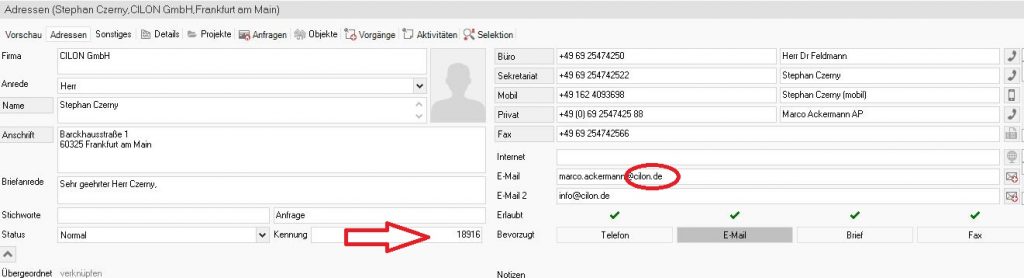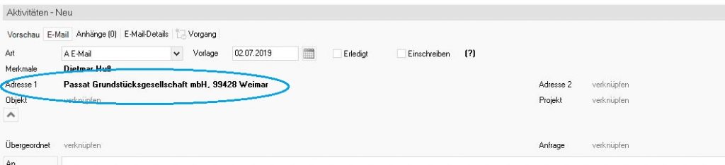 Natürlich müssen auch hier nachträglich die Verknüpfungen zur entsprechenden Firma aktiv hergestellt werden uns zusätzlich die uns bisher unbekannte E-Mail-Adresse in unser System eingetragen werden, damit bei folgendem E-Mailverkehr die Firma automatisch vom System zugeordnet werden kann.