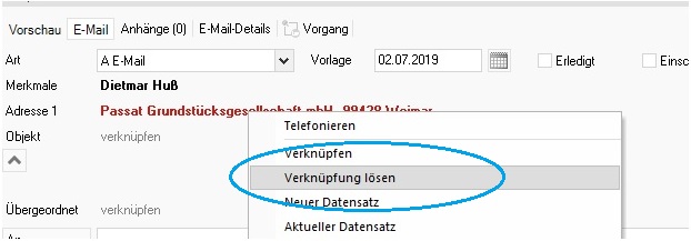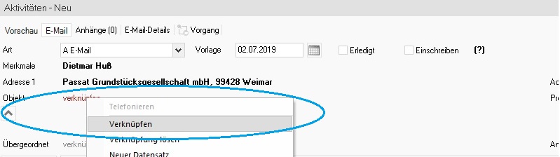 Nun wird auch ein Objekt mit der E-Mail verknüpft, um die E-Mail in der Dokumentation „Aktivitäten des Objekts“ angezeigt zu bekommen. Ein Mausklick mit links auf das Wort „verknüpfen“ neben dem Objekt, ein Menü öffnet sich, und man wählt „Verknüpfen“: