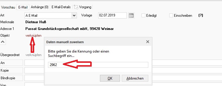 Die E-Mail öffnet sich im Bearbeitungmodus und wie oben beschrieben kann die Objektverknüpfung nachträglich gesetzt werden.