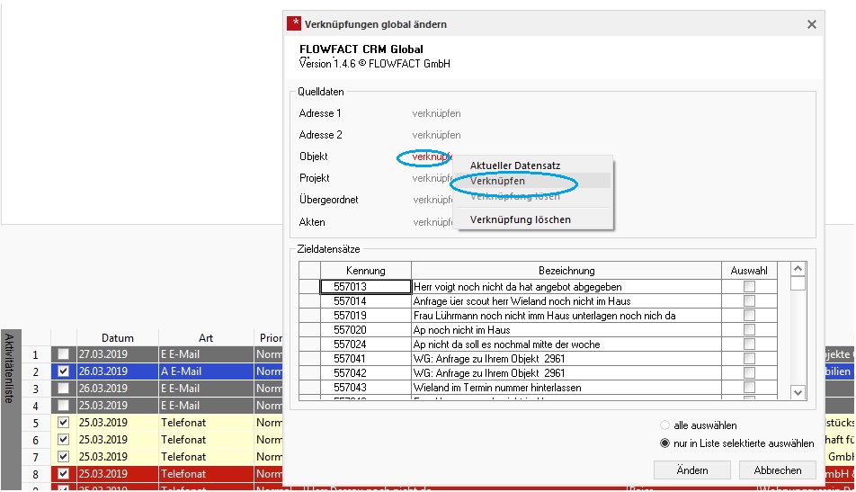 Im nächsten aufgehenden Fenster dann die Objektverknüpfung anwählen und über Eingabe der Objektnummer alle ausgewählten Aktivitäten mit dem Objekt verknüpfen.