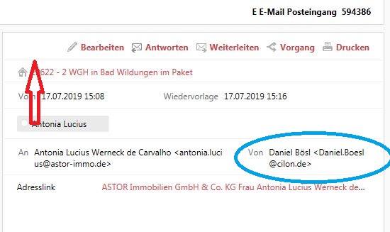 Klickt man diese E-Mail an, sieht man im oberen rechten Bereich den Absender und die fehlende Firmenverknüpfung (roter Pfeil).